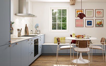 L’astuce incontournable pour agrandir une petite cuisine ? Peindre un seul mur de couleur, cela donne du caractère à la pièce et de la profondeur à l’espace.