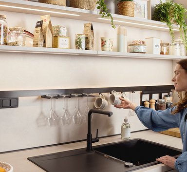 Pour un plan de travail sur îlot central intégrant la zone de lavage, le triangle d’activité doit bien sûr aussi être appliqué et vous devez aussi vérifier les possibilités de raccordement aux évacuations d’eau!