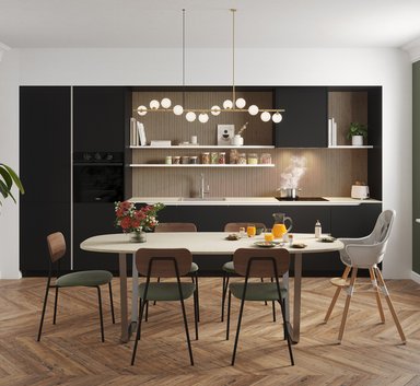 Quand le plan de travail principal se situe sur l’ilot central, l’idéal est qu’il intègre toutes ces zones. Si cela n’est pas toujours possible, on peut l’équiper soit des plaques et de la hotte, soit de l’évier et d’un coin repas. Tout dépend de la place disponible pour l’îlot...