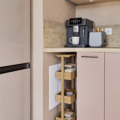 Dans une petite cuisine l’astuce principale consiste à exploiter toute la longueur des murs, du sol au plafond, mais pas avec n’importe quels meubles ! Préférez-les modulables, astucieux et fonctionnels. En ce qui concerne les meubles bas, optez pour des modèles profonds afin d’y ranger vos faitouts et casseroles.