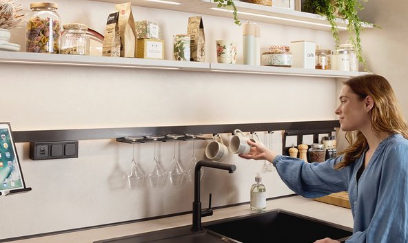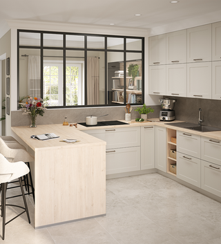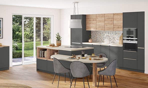 Avec le simulateur de cuisine en ligne, personnalisez les façades et poignées, plan de travail et accessoires sur nos modèles type.