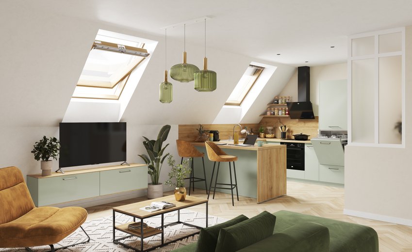 Des suspensions lumineuses au-dessus de l'îlot créent un point focal à la fois beau et fonctionnel. Un tapis dans le salon délimite l’espace détente, un second tapis devant la table repas définit la zone dédiée. Les coussins du canapé reprennent les tons de la crédence ou des façades de cuisine, assurant une continuité. Les plantes vertes apaisent, purifient l’air et humanisent l’ensemble. Quelques touches personnelles affirment votre style sans surcharger. Un papier peint graphique sur un mur apporte du caractère. Des objets d'art soigneusement choisis s’accordent avec la vaisselle exposée sur les étagères ouvertes. Les textiles variés ajoutent texture et chaleur : plaid sur le canapé, linge de table coloré, rideaux légers. Ces éléments transforment un espace fonctionnel en véritable maison accueillante.