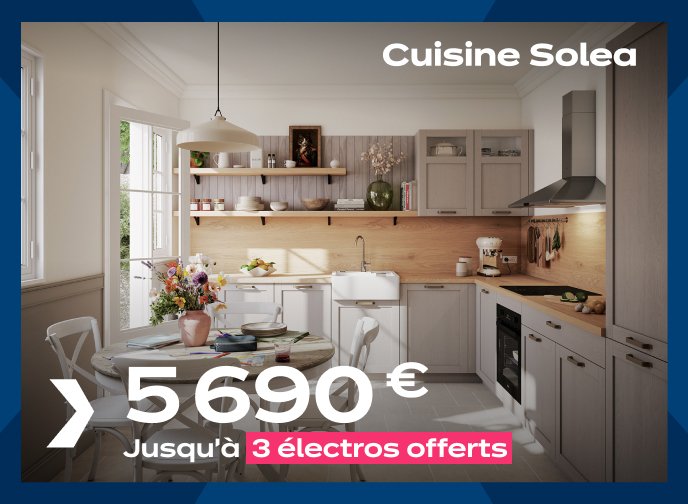 *100% de la pose offerte : Offre valable en France métropolitaine (Corse incluse) du 07 au 31 janvier 2026, hors gamme vita. 250 € offerts sur le coût de la pose par tranche de 2 500 € d’achat (meubles + électroménagers, hors livraison et pose), dans la limite d’une remise de 2 000 € sur le coût de la pose soit : 250 € offerts sur la pose à partir de 2 500 € d’achat, 500 € offerts sur la pose à partir de 5 000 € d’achat, 750 € offerts sur la pose à partir de 7 500 € d’achat, 1 000 € offerts sur la pose à partir de 10 000 € d’achat, 1 250 € offerts sur la pose à partir de 12 500 € d’achat, 1 500 € offerts sur la pose à partir de 15 000 € d’achat, 1 750 € offerts sur la pose à partir de 17 500 € d’achat et 2 000 € offerts sur la pose à partir de 20 000 € d’achat. Offre non cumulable avec d’autres promotions en cours.