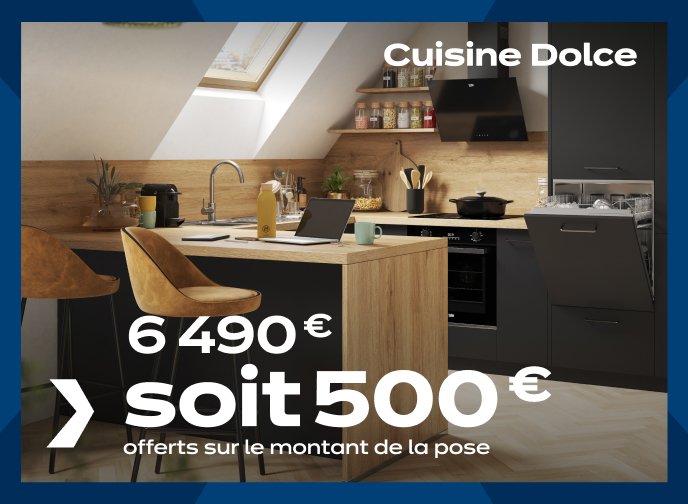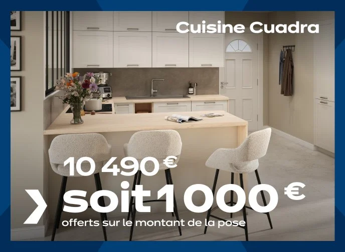 *100% de la pose offerte : Offre valable en France métropolitaine (Corse incluse) du 07 au 31 janvier 2026, hors gamme vita. 250 € offerts sur le coût de la pose par tranche de 2 500 € d’achat (meubles + électroménagers, hors livraison et pose), dans la limite d’une remise de 2 000 € sur le coût de la pose soit : 250 € offerts sur la pose à partir de 2 500 € d’achat, 500 € offerts sur la pose à partir de 5 000 € d’achat, 750 € offerts sur la pose à partir de 7 500 € d’achat, 1 000 € offerts sur la pose à partir de 10 000 € d’achat, 1 250 € offerts sur la pose à partir de 12 500 € d’achat, 1 500 € offerts sur la pose à partir de 15 000 € d’achat, 1 750 € offerts sur la pose à partir de 17 500 € d’achat et 2 000 € offerts sur la pose à partir de 20 000 € d’achat. Offre non cumulable avec d’autres promotions en cours.